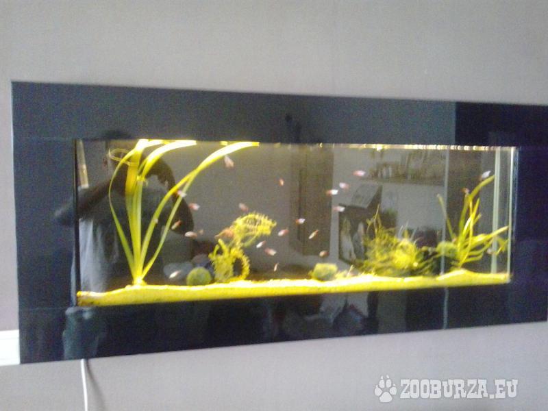Popis: Prodám nastěnné akvarium o rozměrech 110x40x11 cca 50 L. AKVARIUM není náročné na udržbu cca co 14 dní 20 min. - jedná se o komplet, stěrk , pisek ,kryty,zavěšovací systém - jednoduchá instalace, filtrace, LED osvětlení s dalk.ovladačem měnící barvy. Po dohodě zašlu kurýrem. Začínajícím poradím.Přední deska jde nechat nabarvit na jakou koliv barvu. mám v tom neonky a krevetky. více foto , info emailem nebo po tel.